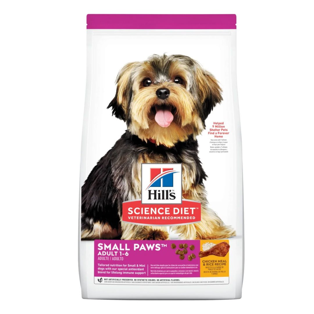 Gran amor, pequeña estatura. ™ Hill’s® Science Diet® Small Paws™ Adult Dry Dog Food está nutricionalmente diseñado para satisfacer las necesidades únicas de perros pequeños y perros pequeños durante sus mejores años de vida. sorbos especiales. Ingredientes fáciles de digerir para una digestión saludable Una mezcla nutritiva de Omega 6 y vitamina E para una piel saludable y ropa exterior lujosa Proteína de alta calidad para músculo magro Contiene nuestra mezcla especial de antioxidantes Small & Mini para un respaldo inmunitario de por vida